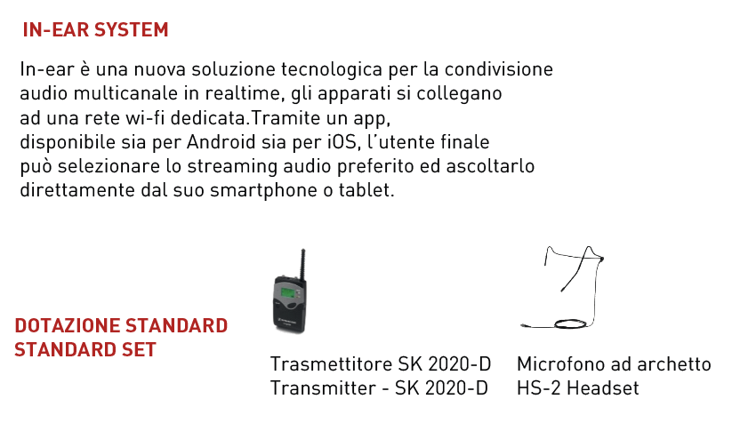 In-ear è una nuova soluzione tecnologica per la condivisione audio multicanale in realtime, gli apparati si collegano ad una rete wi-fi dedicata.